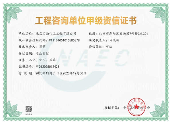 工程咨詢單位甲級資信證書(石化、化工、醫(yī)藥)