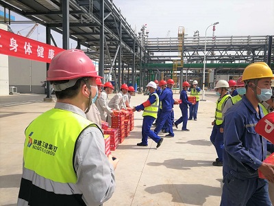 近日,陜建集團黨委常委、董事,延長化建黨委書記高建成,延長化建董事、黨委副書記符杰平,延長化建總經理康宇麟,延長化建總法律顧問鄭發龍一行,來到北京石油化工工程有限公司總承包項目榆能化一期填平補齊工程現場,進行了暑期慰問和視察。