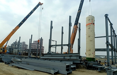 目前,國內(nèi)安裝技術人員已陸續(xù)到達項目現(xiàn)場,開展各類設備的安裝、指導及培訓工作。鐵鉬法甲醛裝置設備安裝已完成30%,銀法甲醛裝置設備安裝已完成40%;聯(lián)合裝置框架設備安裝完成50%,氧化劑罐安裝工作正在緊張進行中。