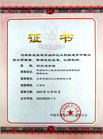 近日,中國石油和化學(xué)工業(yè)聯(lián)合會公示了《2023年度科學(xué)技術(shù)獎》獲獎成果,北京石油化工工程有限公司“液相烴中二氧化硫吸附法高精度脫除新技術(shù)”榮獲2023年度中國石油和化學(xué)工業(yè)聯(lián)合會科技進步獎三等獎。