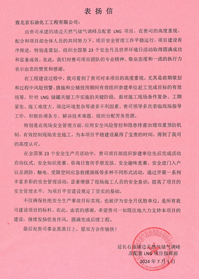 近日,由北京石油化工工程有限公司(簡稱:北油工程)總承包的延長石油靖邊天然氣儲氣調(diào)峰及配套LNG項目安全生產(chǎn)工作得到延長石油煉化公司肯定,項目部獲得2024年度“安全生產(chǎn)月”活動“先進(jìn)單位”稱號,3名員工獲得“安全之星”稱號。并收到表揚信,對北油工程在項目建設(shè)期間,規(guī)范的安全管理,有序的項目建設(shè),專業(yè)的團(tuán)隊表示感謝。