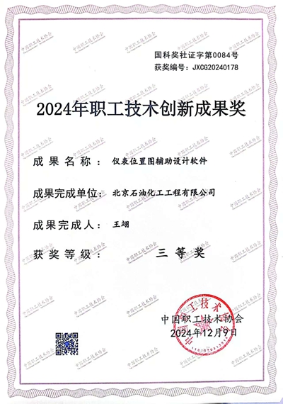 近日,在2024年全國職工技術創新成果評比中,北京石油化工工程有限公司自主研發的“圓形塔器平臺材料統計軟件”和“儀表位置圖輔助設計軟件”分別斬獲二等獎、三等獎,展現了公司在石化工程數字化領域的創新實力。