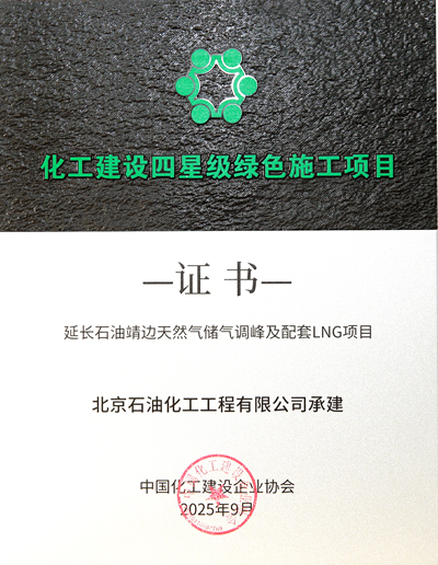 近日,由北京石油化工工程有限公司(簡稱"北油工程")總承包的延長石油靖邊天然氣儲氣調峰配套LNG項目,憑借在綠色施工領域的卓越表現,榮獲"化工建設四星級綠色施工項目"稱號。該榮譽的獲得,不僅是對項目建設團隊綠色施工實踐的高度認可,更彰顯了北油工程在踐行綠色發展理念、推動化工建設行業高質量發展方面的堅實實力。